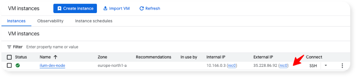 To connect to Ilum, copy the External IP of the virtual machine into your browser bar (you can find it in Google Cloud in the list of VM instances, see below) and append ":31777" to it.