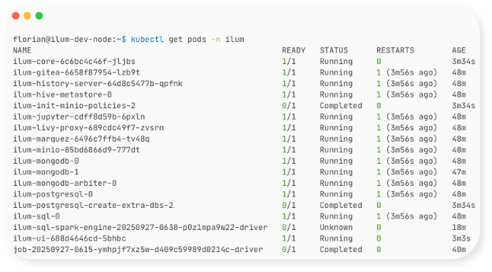 kubectl get pods -n ilum Ilum is ready to connect once all of its core containers are running again: