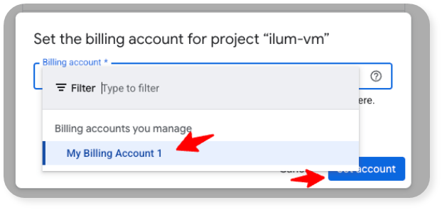 - Select the billing account you created in step 3 above and the click on "Set account":