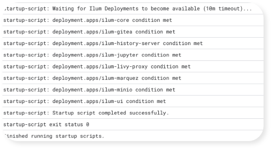 --metadata-from-file startup-script=start_vm.sh Once you have made all necessary adjustments, execute the code. Now, the machine should start up. This step installs Kubernetes, Helm, and Ilum so you can explore a development-grade data lakehouse on a single VM.