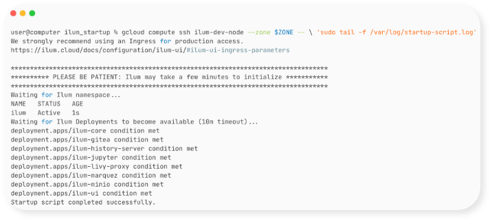 gcloud compute ssh ilum-dev-node --zone $ZONE – \ 'sudo tail -f /var/log/startup-script.log'Wait until "Startup script completed successfully." appears, this may take a couple of minutes:
