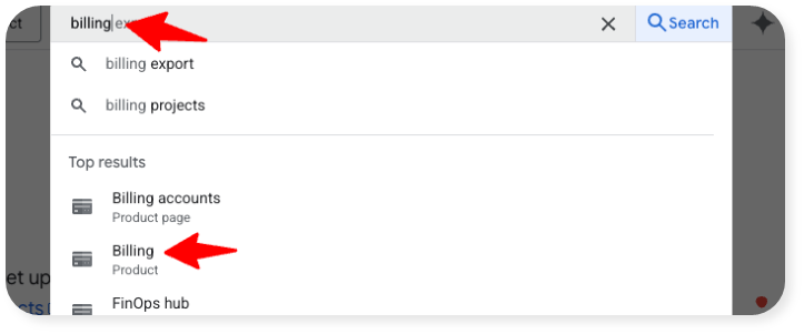 - Click on the search bar on the top and search for "billing". Once the "Billing" product appears, click it.