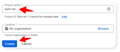 c. Enter "ilum-vm" as a project name. You can leave the organization unassigned, then click "Schaffen ":