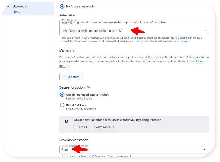 - Im "Advanced" tab: Download the startup script below, open it in a text editor, and copy and paste its contents into the "Startup script" field. Then, select "Spot" as VM provisioning model (optional, read more about this in Step 2 under "Step 6: Launch the Virtual Machine" above):